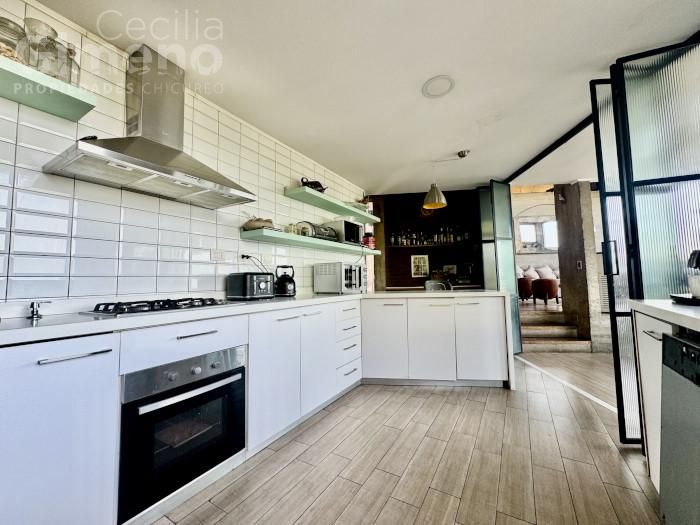 - cocina integrada con comedor de diario con puerta de vidrio abatible, equipada con horno eléctrico-campana-encimera