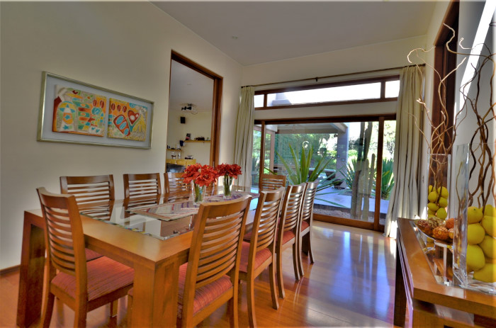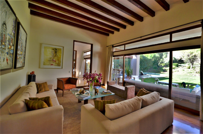 - Living y comedor separados de gran altura, vigas a la vista, con gran vista al jardín y cancha de golf