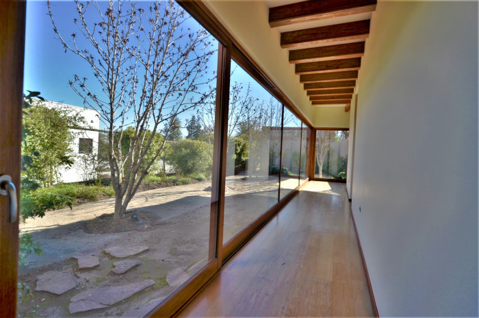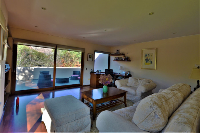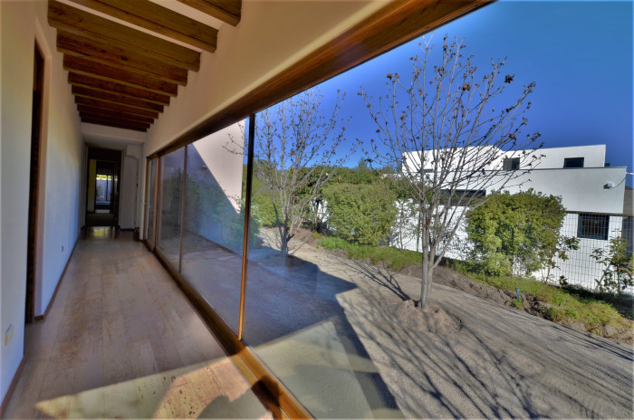 La casa está muy bien mantenida, de arquitectura contemporánea, completamente de hormigón y terminaciones de alto estándar, con pisos de madera en toda la casa, excepto dormitorios, y ventanas doble panel de madera de cedro. Destaca el acceso de la casa a través de un generoso hall de doble altura y vigas a la vista, que logra una transparencia con la primera vista al jardín, el cual distribuye a su izquierda el living y comedor separados, con linda vista al exterior, una sala de estar con proyector de cine, y salida a la terraza y quincho completo, también a una gran cocina con comedor de diario y vista a jardín interior y huerta, con amplios espacios y una isla central, dormitorio de servicio y logia con lavandería interior, en un subterráneo destaca una amplia cava de vinos. Desde el hall a la derecha se accede a los dormitorios, todos en suite y amplios. Dormitorio principal con doble walk-in closet y baño completo con jacuzzi y ducha romana y jardín interior.