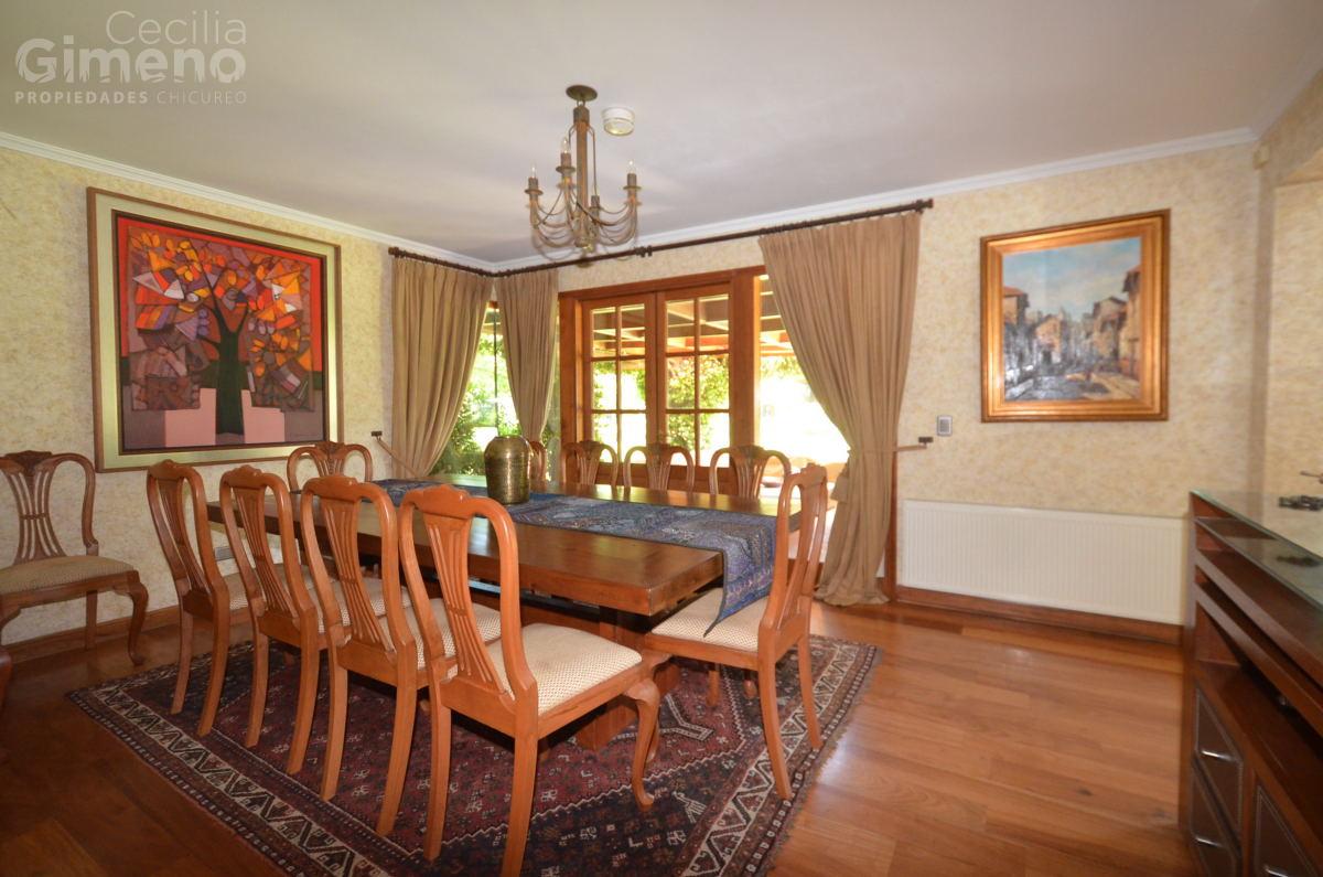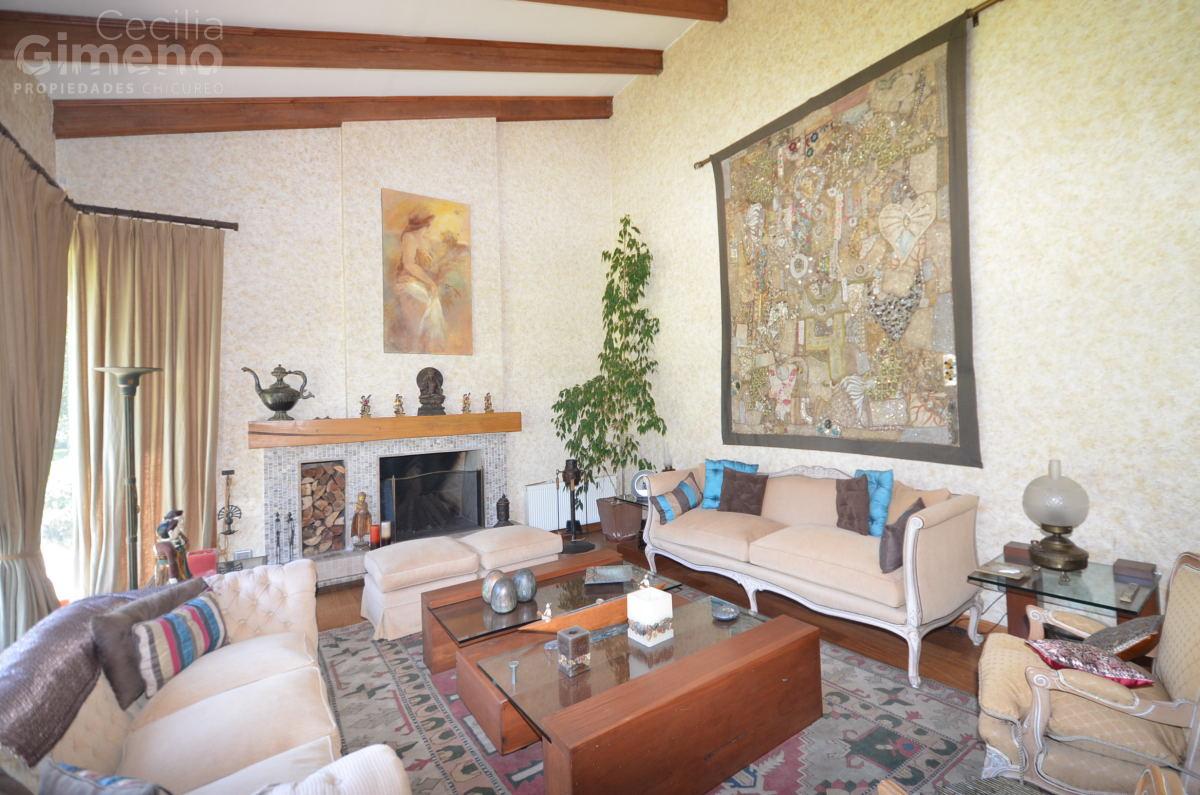 - Living con chimenea y vigas a la vista, comedor independiente, ambos con piso de madera