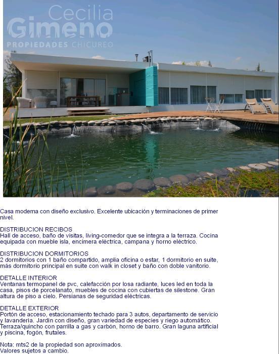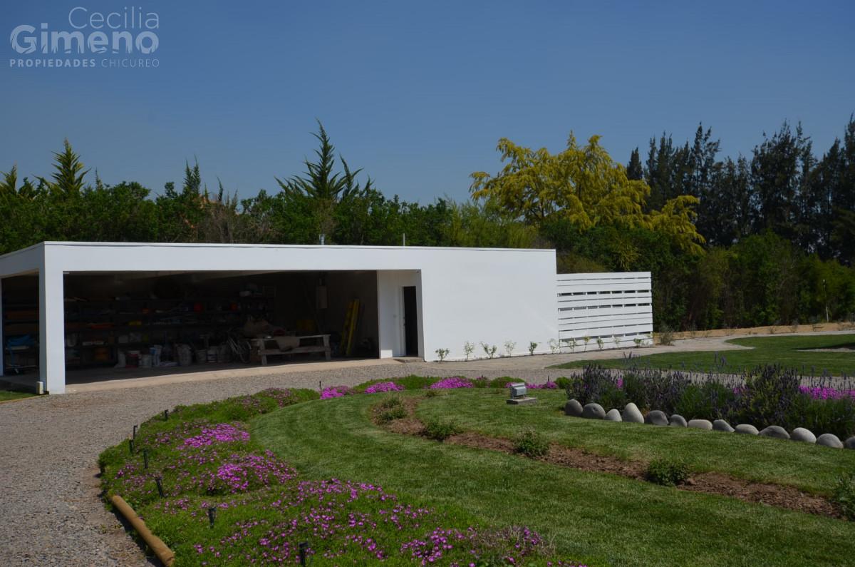 Portón de acceso, estacionamiento techado para 3 autos, departamento de servicio y lavandería. Jardín con diseño, gran variedad de especies y riego automático. Terraza/quincho con parrilla a gas y carbón, horno de barro. Gran laguna artificial y piscina, fogón, frutales.