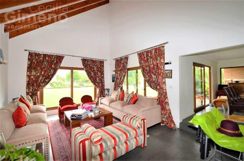 - living con techo de doble altura y con vigas a la vista, bar
