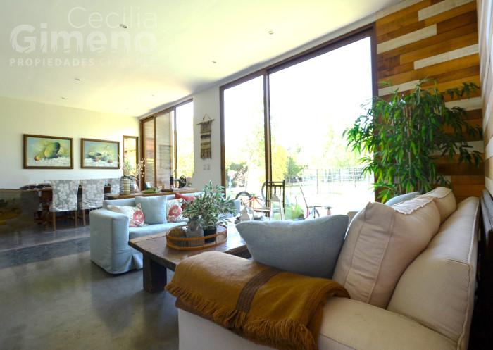 - living-comedor con estufa a leña, piso de cemento refinado, salida al jardín