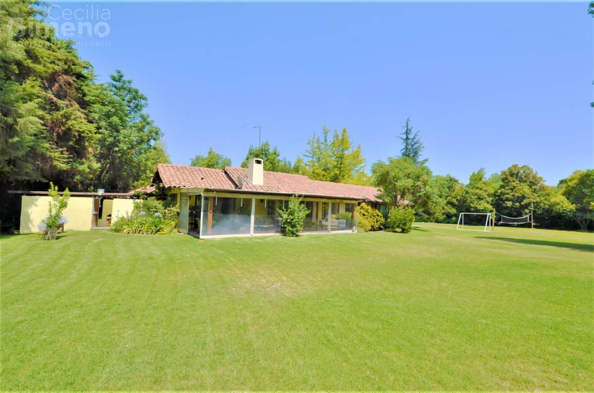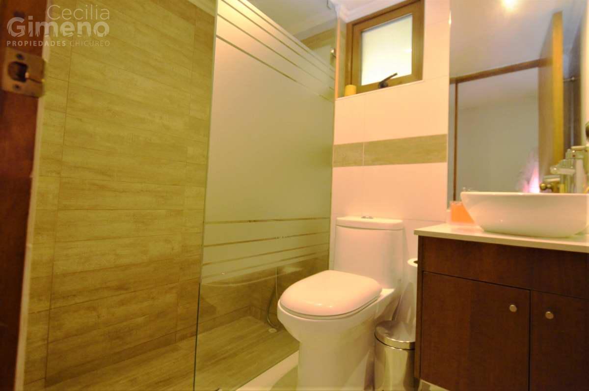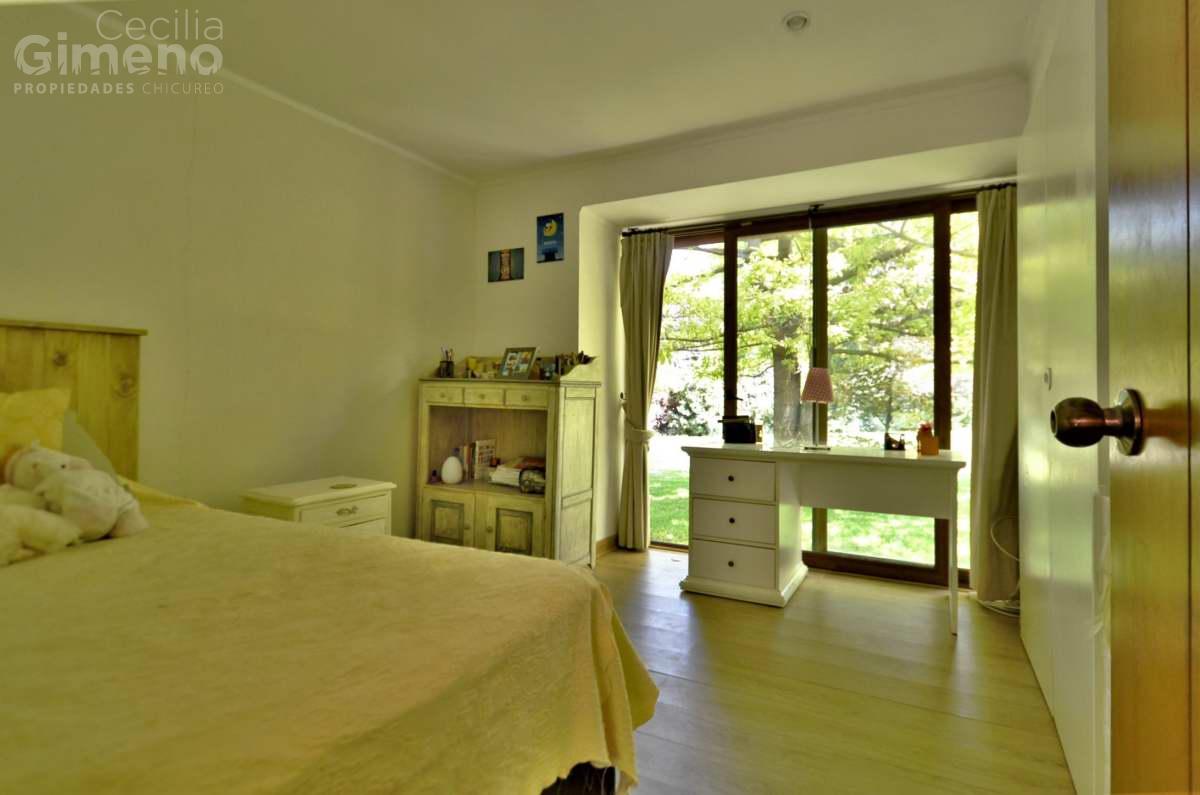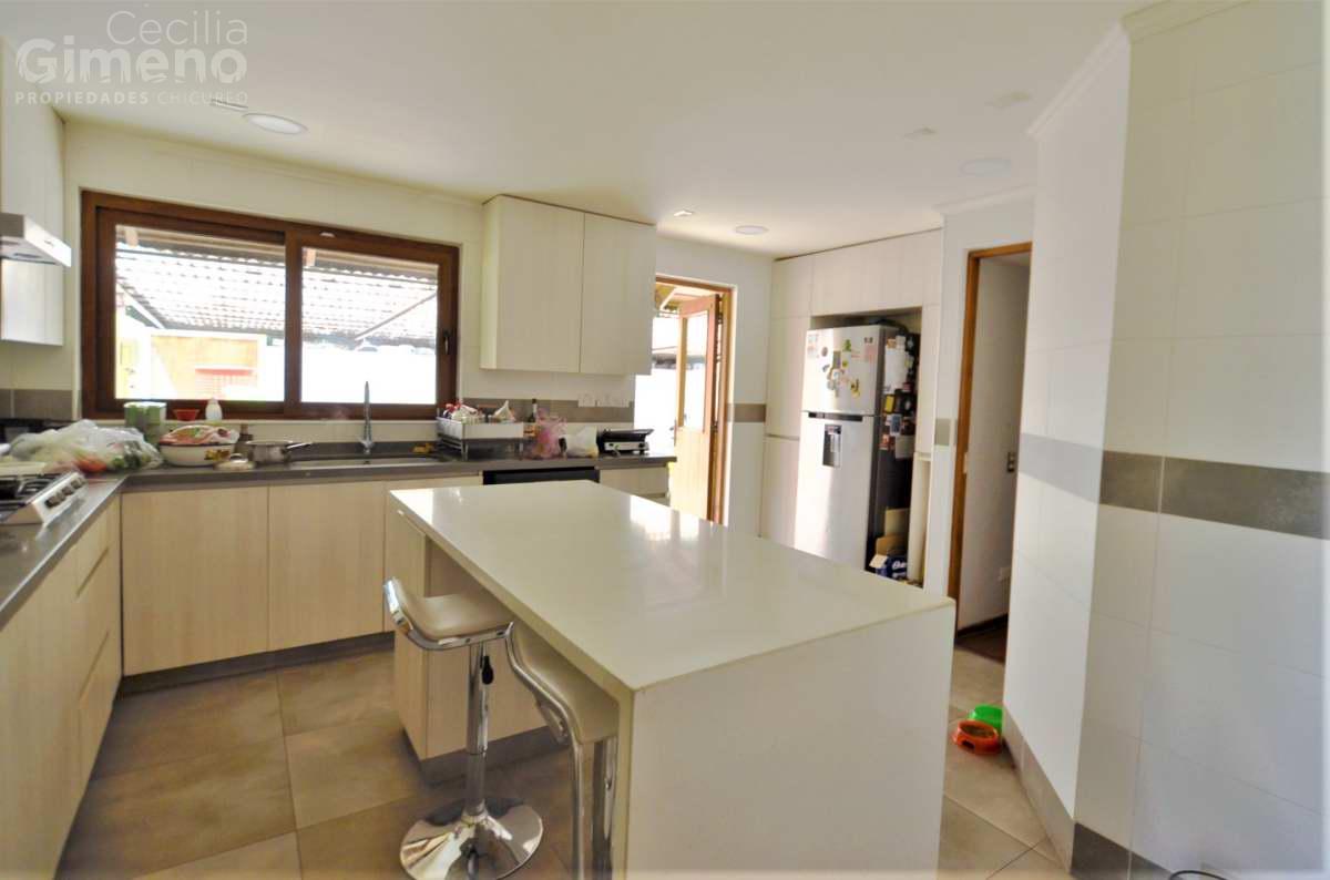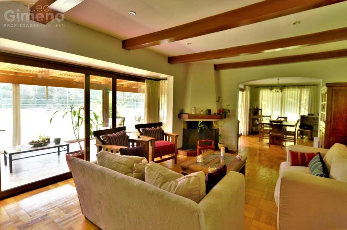 Hall de acceso luminoso, living con vigas a la vista y chimenea, comedor independiente, ambos con piso de parquet y salida a terraza techada. Cocina con comedor de diario isla, equipada con campana-encimera-horno eléctrico, dormitorio y baño de servicio, logia techada.