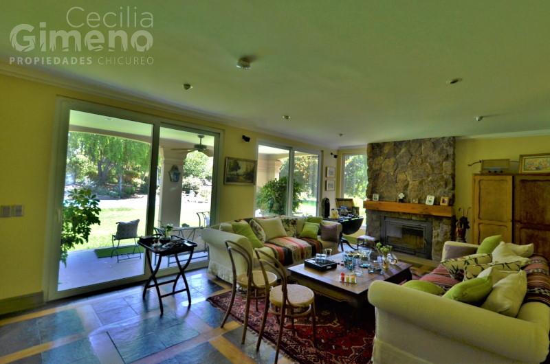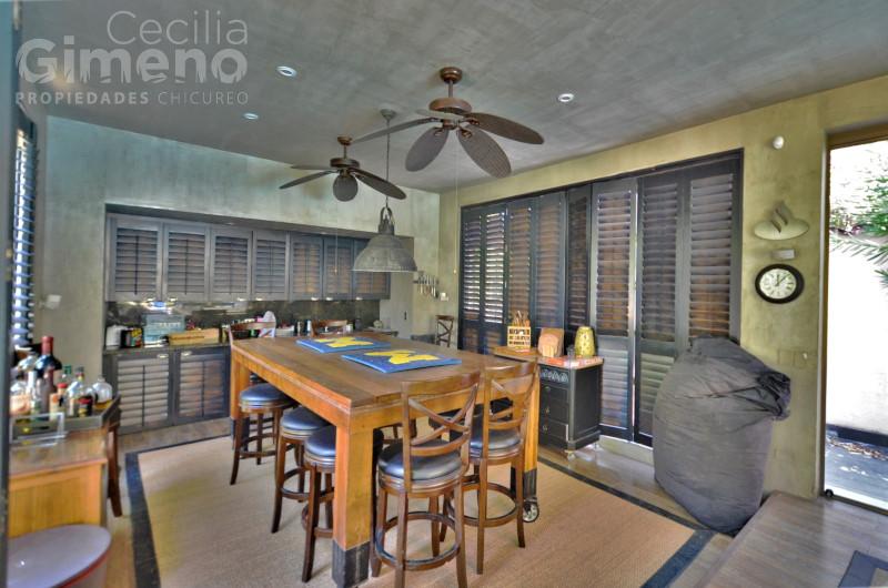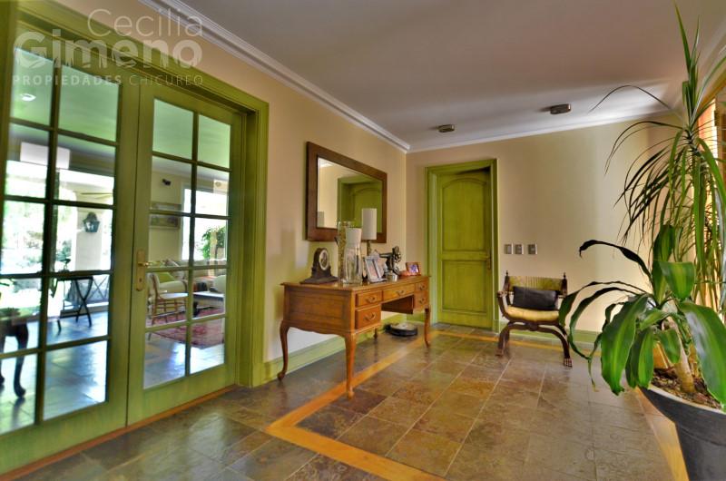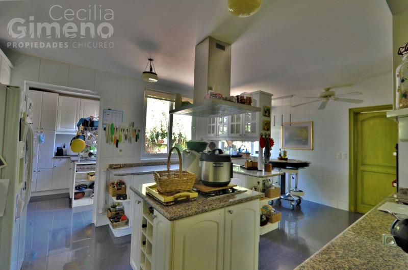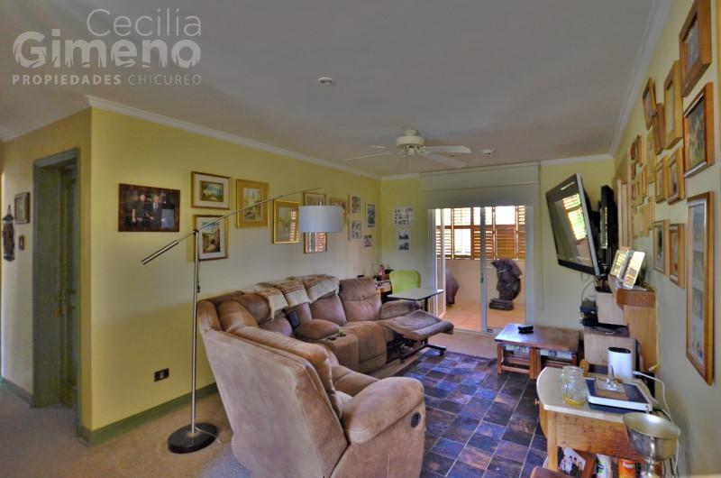 Hall de acceso con piedra pizarra, baño de visitas. Amplio living con chimenea y comedor independiente, ambos con piso de piedra pizarra con madera. Cocina amplia con mueble isla, equipada con encimera a gas-campana-horno eléctrico, logia, pieza y baño de servicio, patio de servicio.