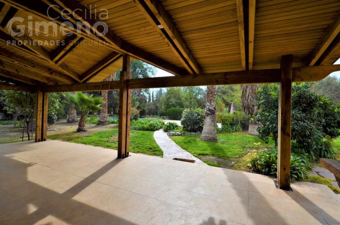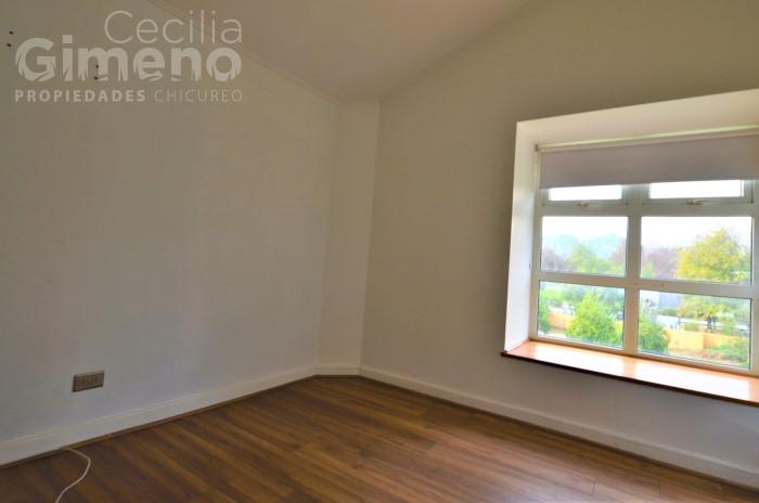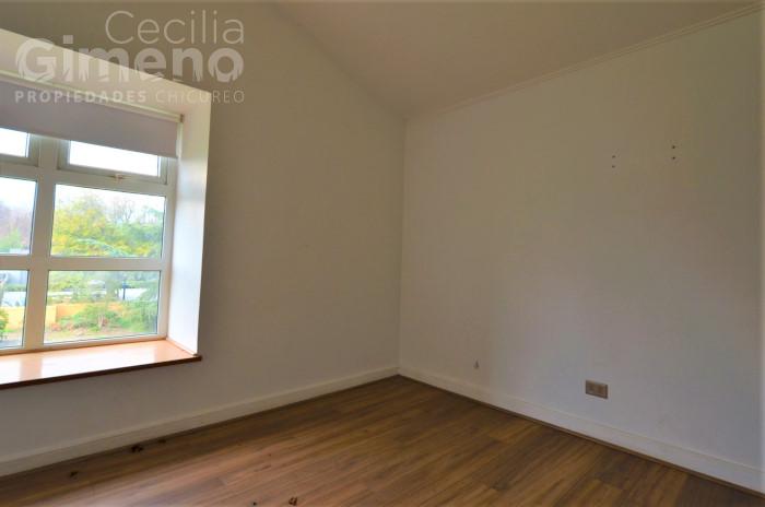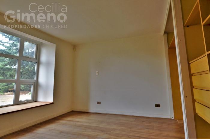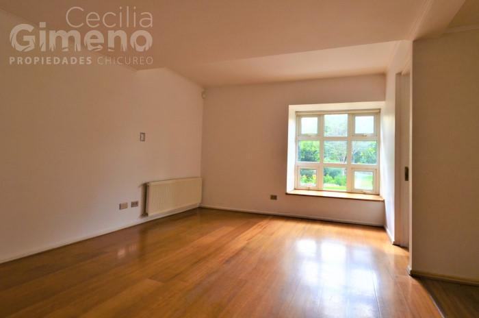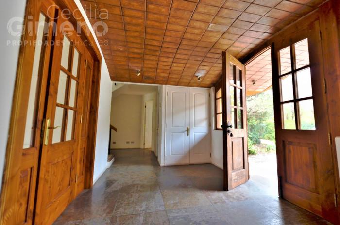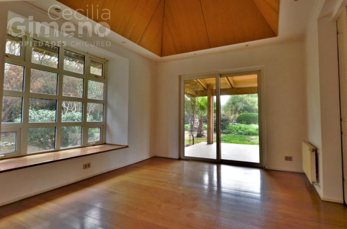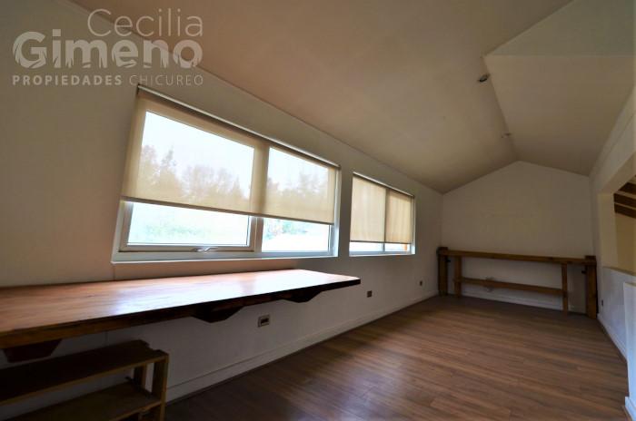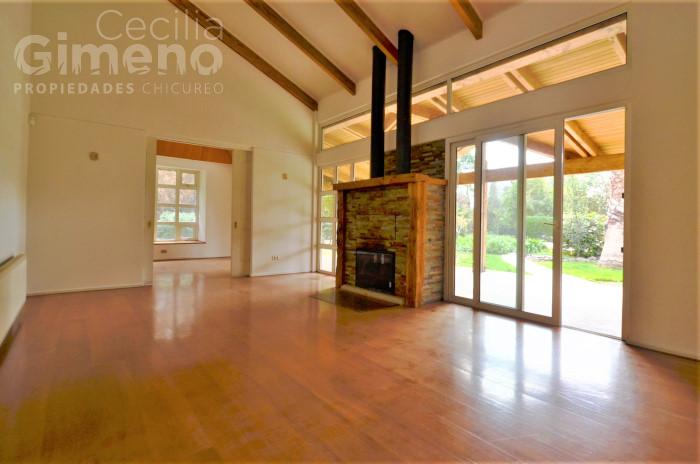 - living con techo de doble altura y vigas a la vista, estufa a leña, salida a terraza techada, comedor independiente, ambos con piso flotante