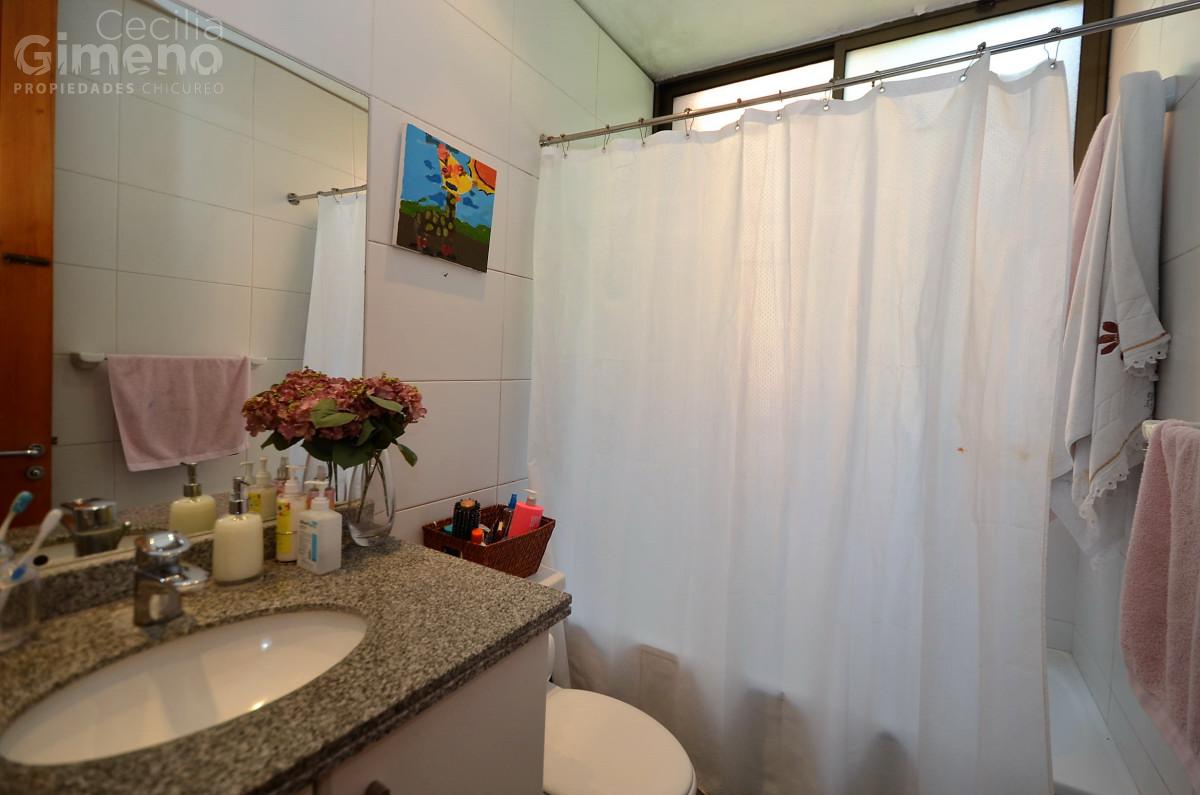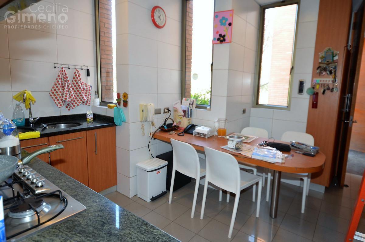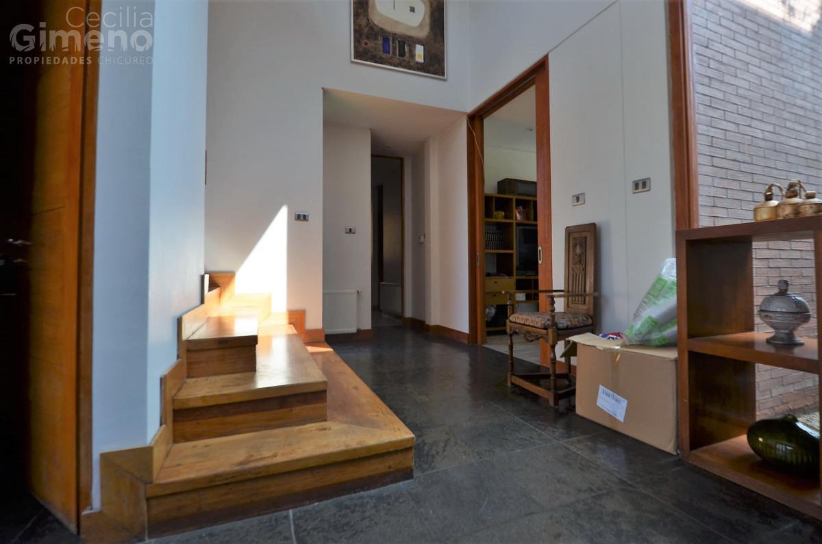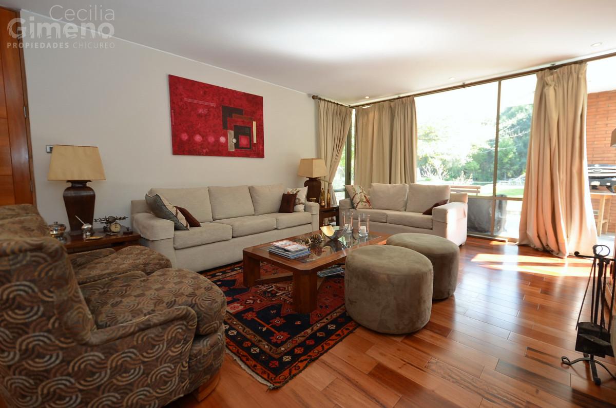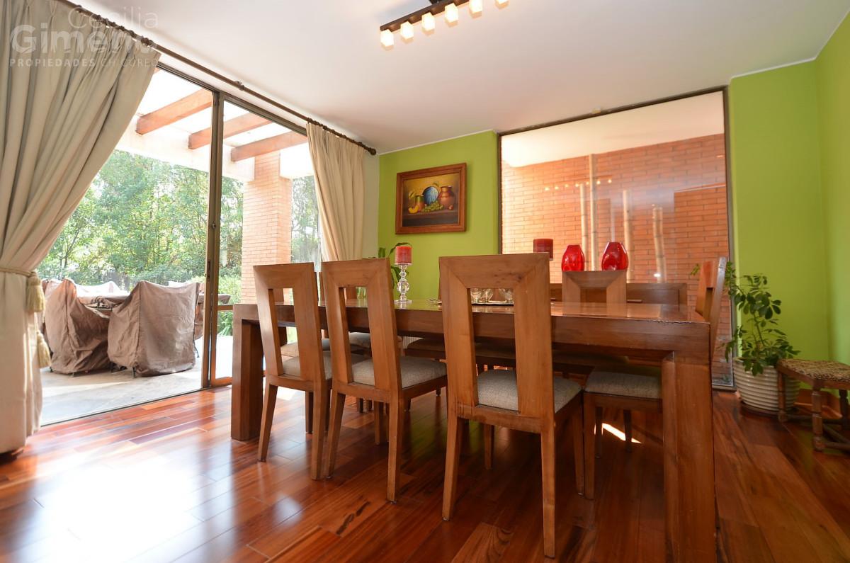 Hall de acceso con vista al jardín y piso de piedra pizarra, baño de visitas, living con chimenea, comedor independiente, ambos con piso de madera y salida a terraza. Cocina, amplio patio de servicio techado (tendedero-lavadero-bodega), dormitorio de servicio.