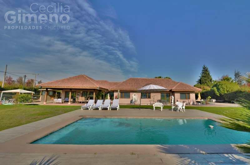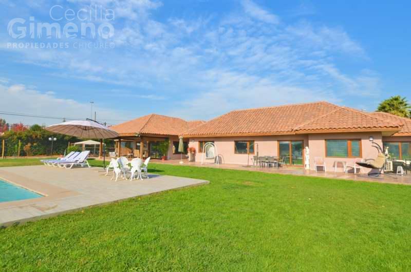 Portón automático, terraza techada, piscina con cascada de piedra.