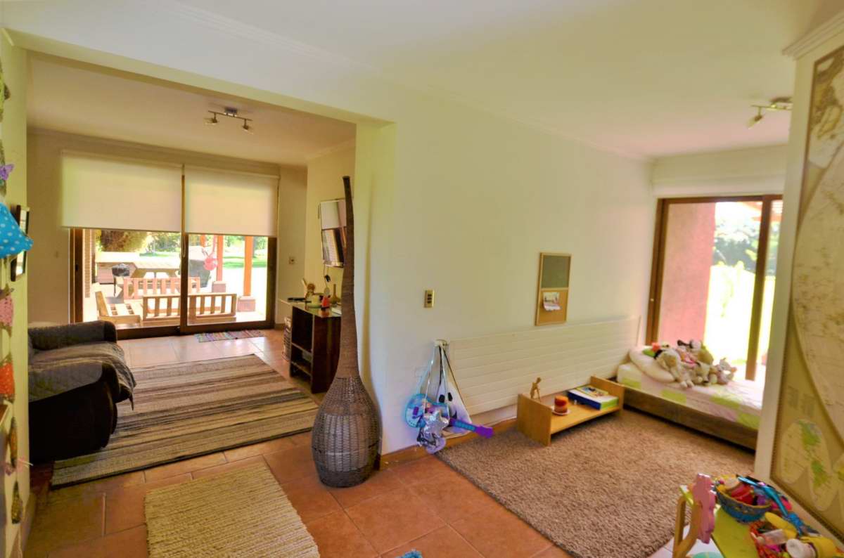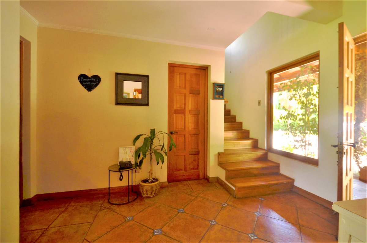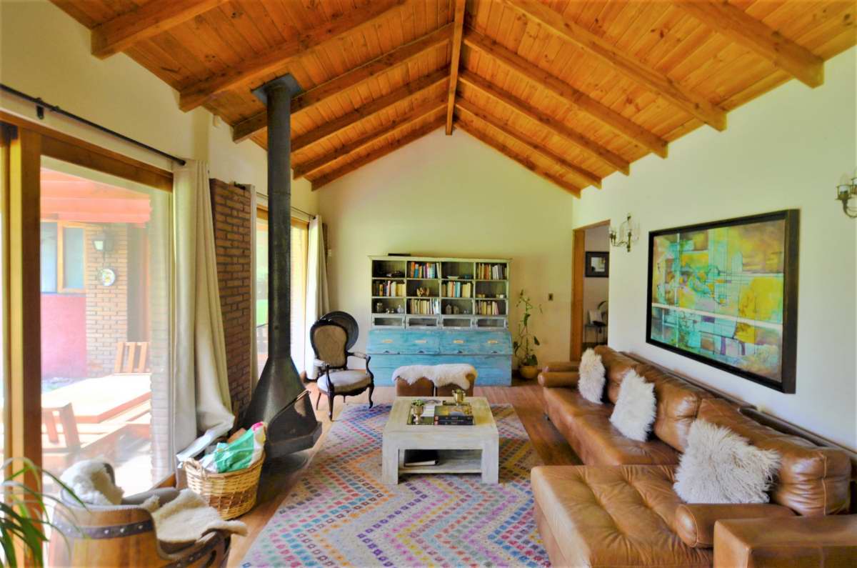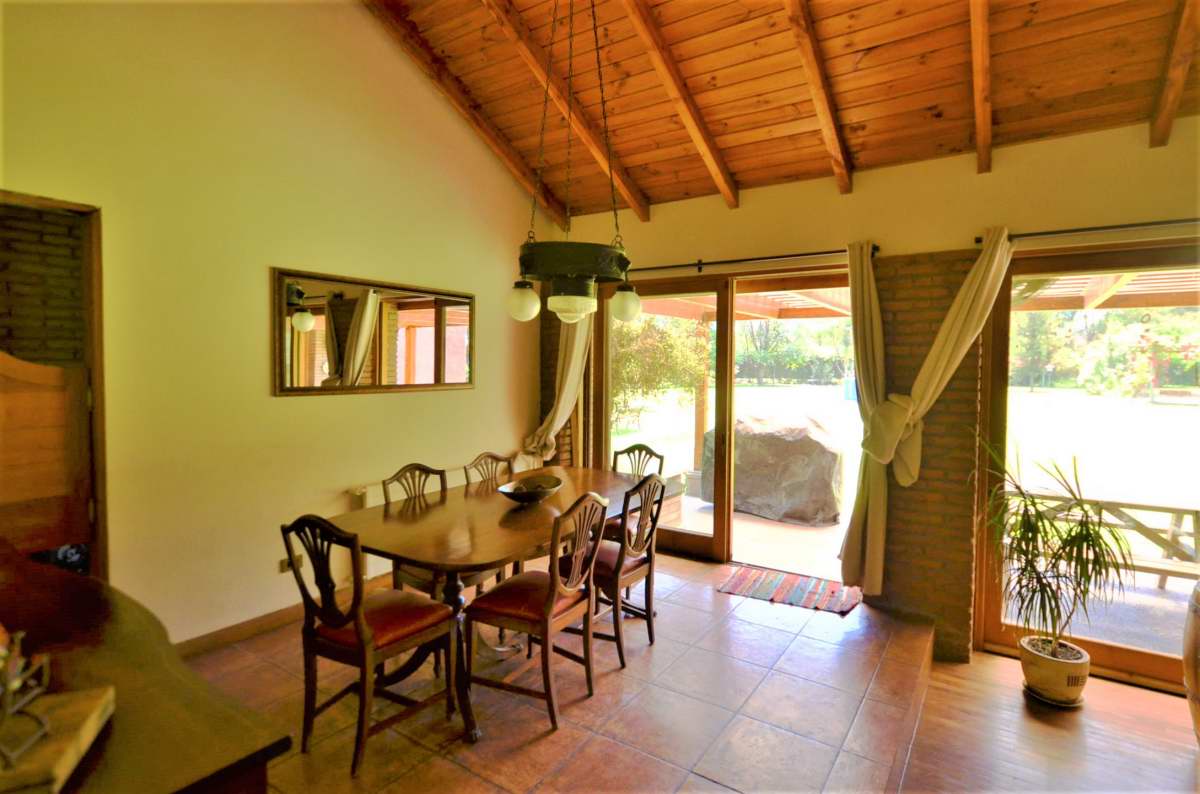Amplio hall de acceso, baño de visitas, living con chimenea, piso de madera, comedor con piso de cerámica, vigas a la vista. Cocina amoblada y equipada con encimera-horno-campana, dormitorio de servicio con baño, lavadero.