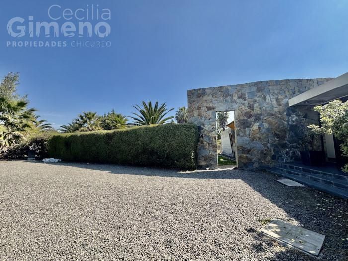 - amplio hall de entrada con muros de piedra y vista al jardín