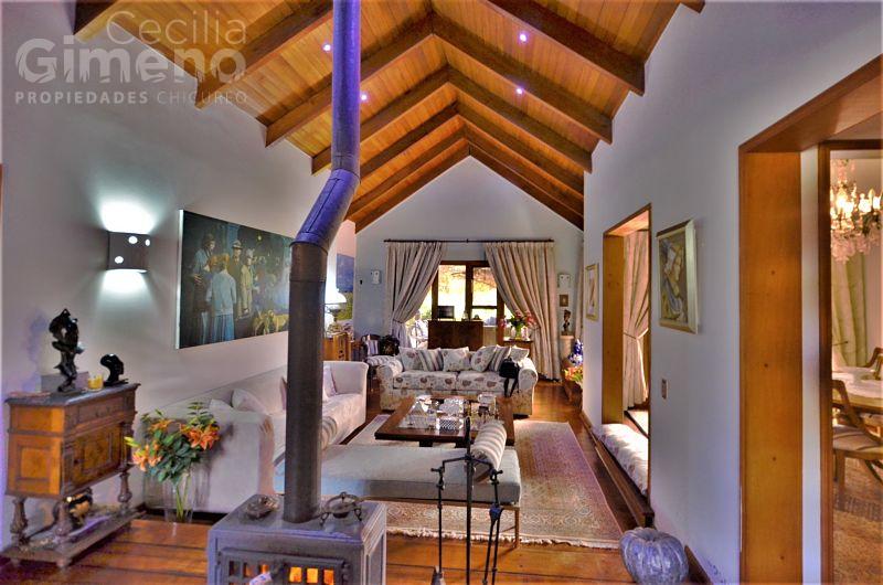 - living con salamandra y vigas a la vista, piso madera Cedro boliviano